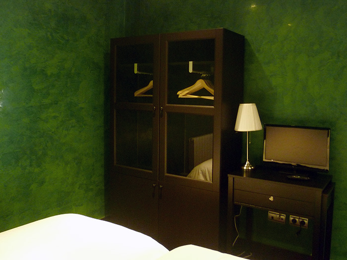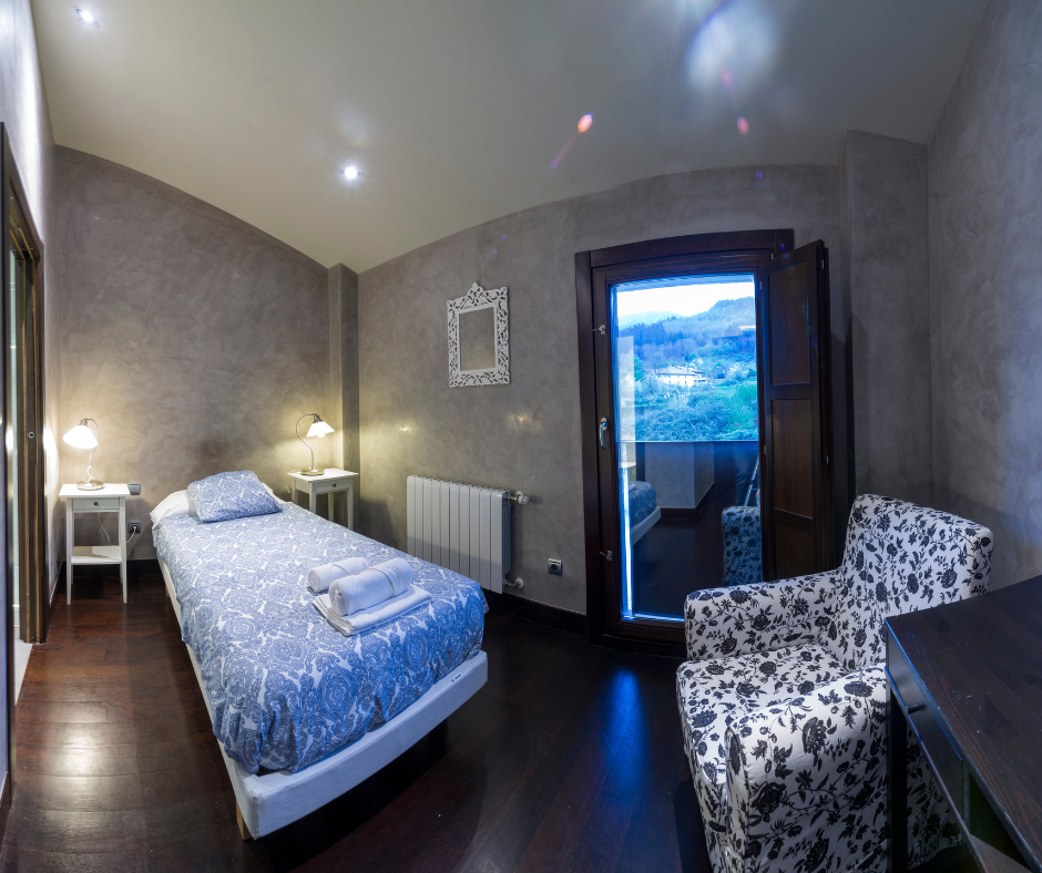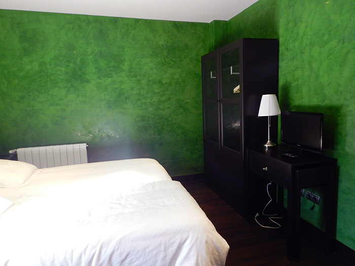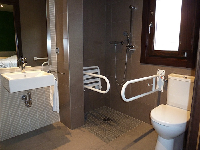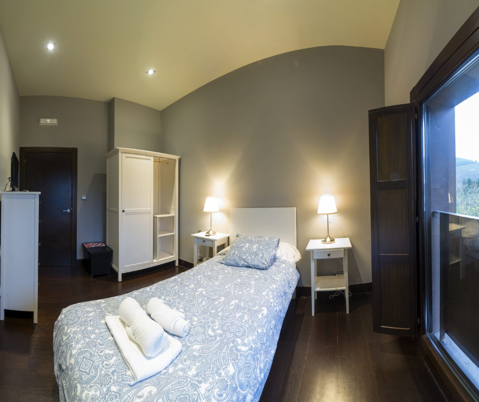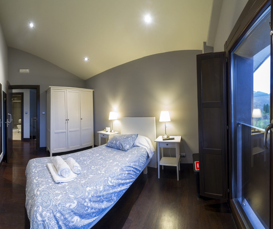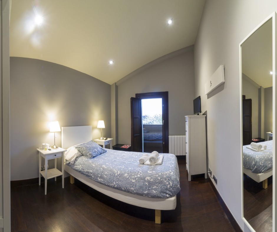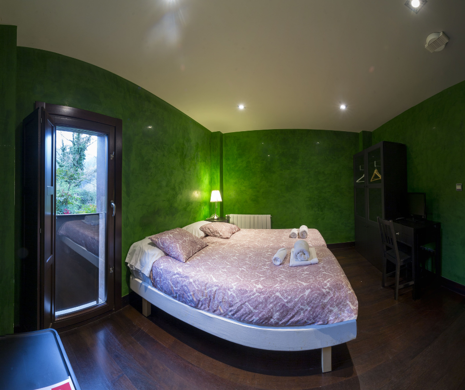 Habitación accesible en la plata baja de Kutxatxuri, decorada en tonos verdes que dispone de baño adaptado para personas con movilidad reducida.