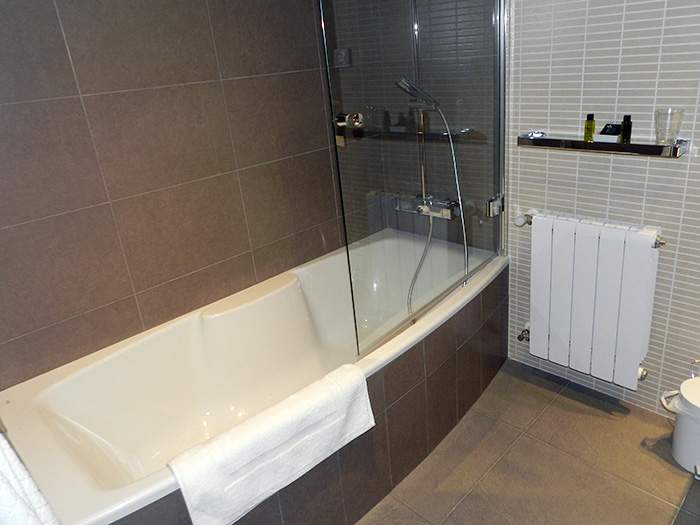 Espaciosa habitacion individual decorada en tonos grises y con vistas al jardin, muy tranquila y relajante. Baño incorporado con ducha en tonos azules.