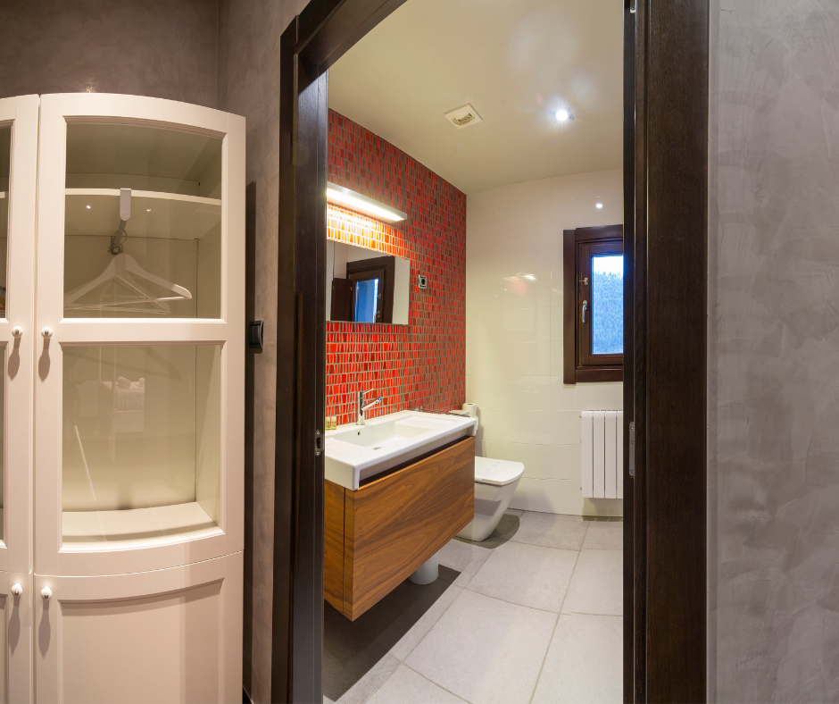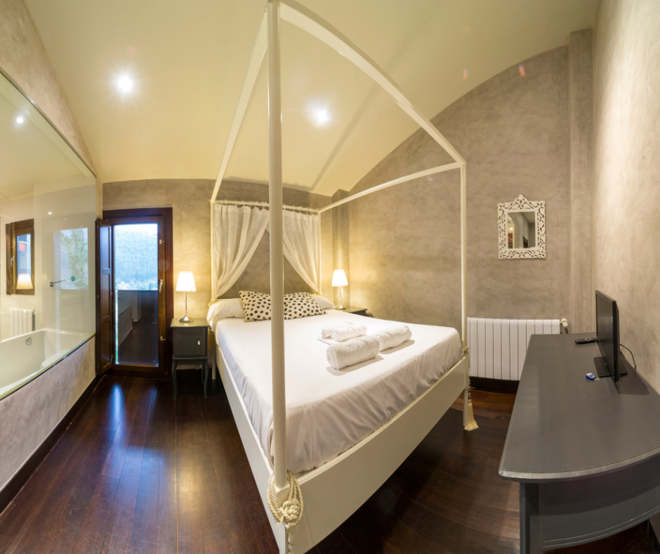 Habitación muy romántica con amplia cama de matrimonio con dosel y pared de cristal comunicada al baño decorado en tonos rojos. Dispone de un pequeño vestidor.
