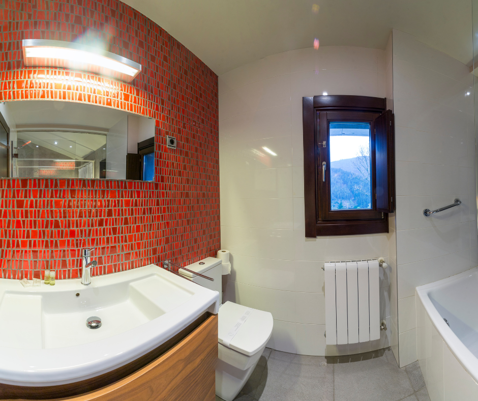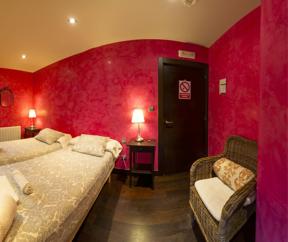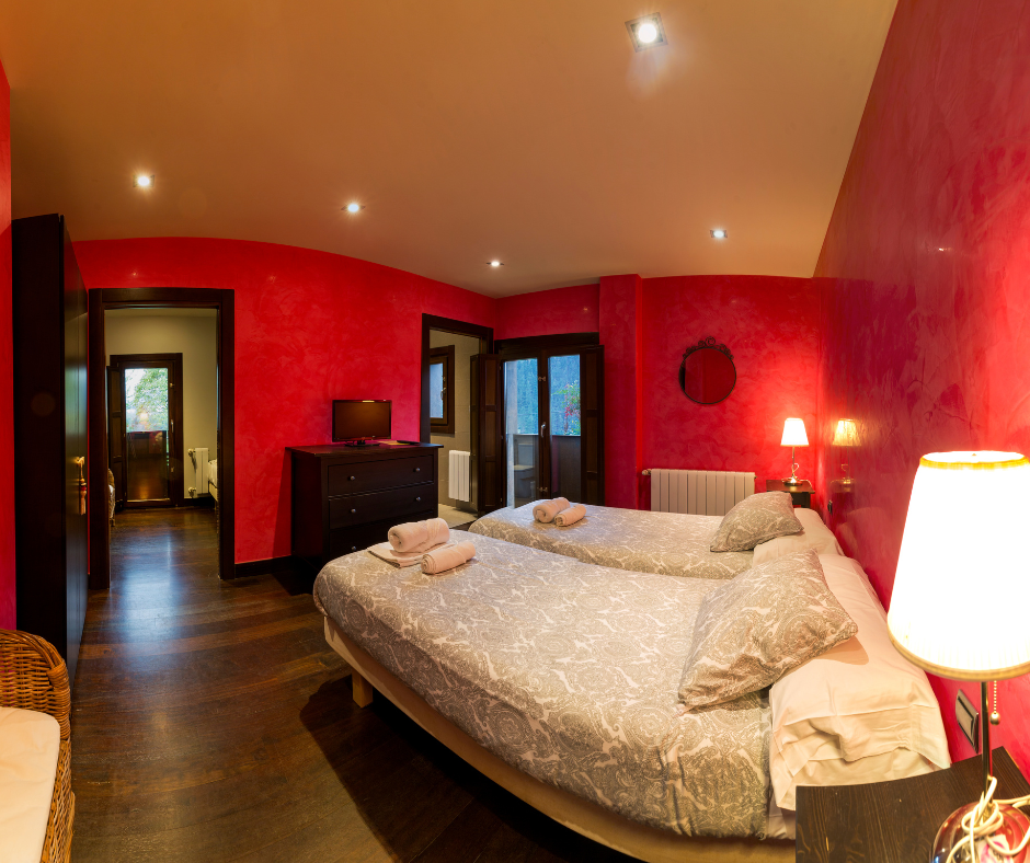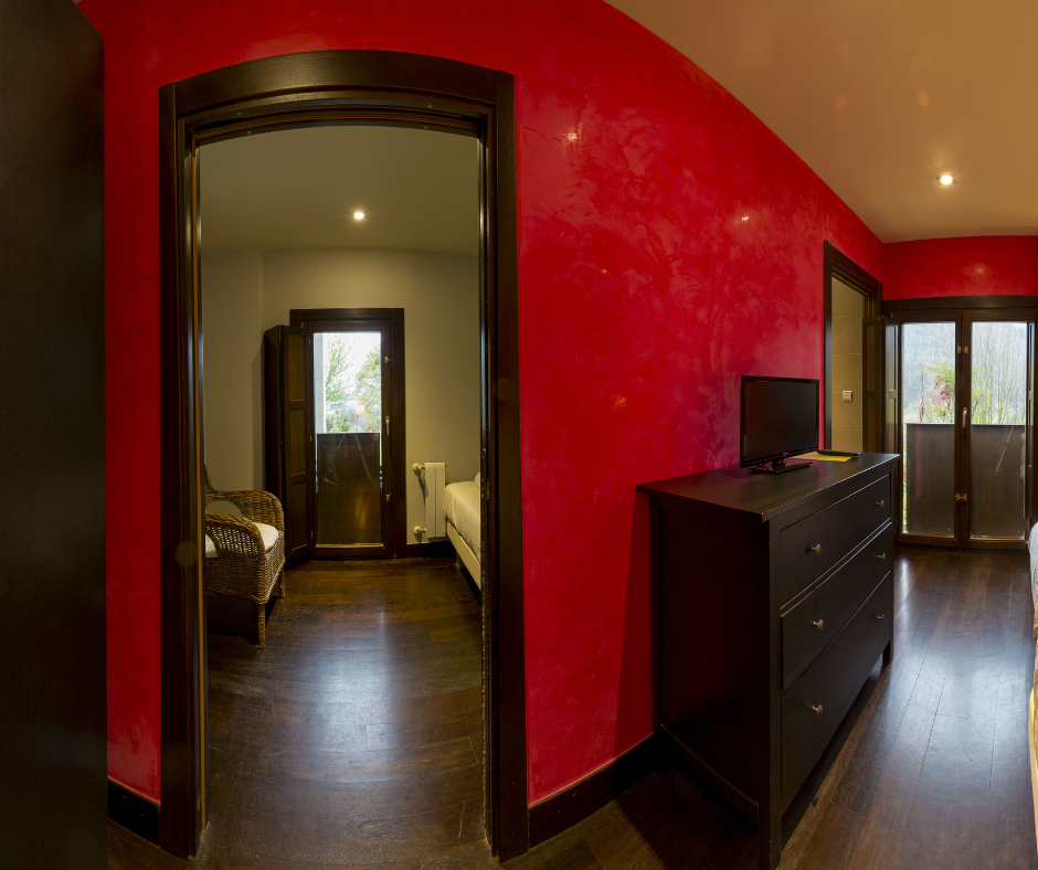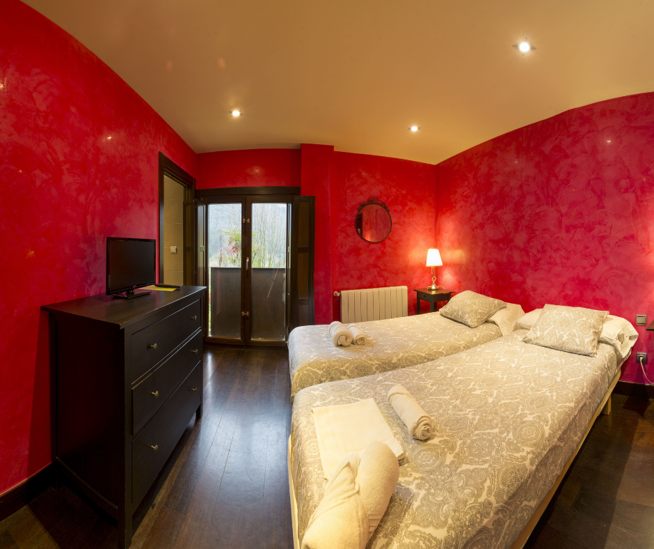 Habitación muy coqueta decorada en tonos rojo con vistas al jardín. Se encuentra situada en la planta primera de Kutxatxuri.